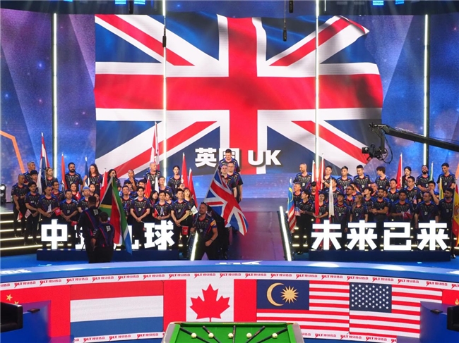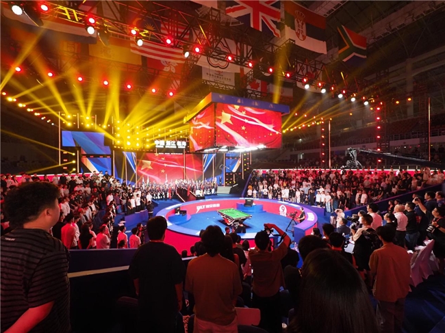 接下来,全场肃立,《中华人民共和国国歌》奏响。在这一庄重时刻,家国情怀在赛场流淌,彰显了中式九球运动扎根中国、向世界传播中华文化的使命,也凝聚起了运动员与观众共同的精神力量。