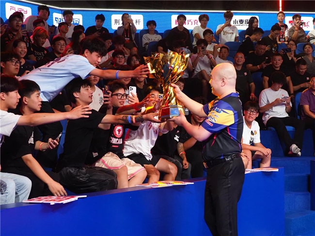 随着灯光渐暗,追光灯骤然聚焦,中国运动员代表杨帆携独牙传奇顶级荣誉象征 —— 荆棘王冠杯登场。这尊奖杯设计独特,既以造型象征选手一路走来的艰辛,又在底座中融入 “不屈、逆袭,我即传奇” 的赛事精神,是对所有拼搏者的崇高致敬。