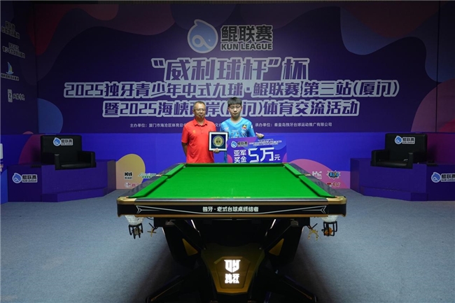 9 月 7 日,“威利球杆”杯2025独牙青少年中式九球・鲲联赛第三站(厦门站)暨2025海峡两岸(厦门)体育交流活动圆满落幕。历经11天的激烈角逐,范林凯在众多参赛选手中脱颖而出,并在决赛中展现超强实力,成功问鼎本站鲲联赛小球王,斩获10万元奖金及冠军奖杯。在《骄傲的少年》激昂的音乐声中,范林凯将冠军奖杯高高举起;杨皓铭获得亚军,获奖金5万元;夏李傲与周坤并列季军,各获奖金3万元;夏李傲凭借24金斩获搏金王,获2000元奖金。